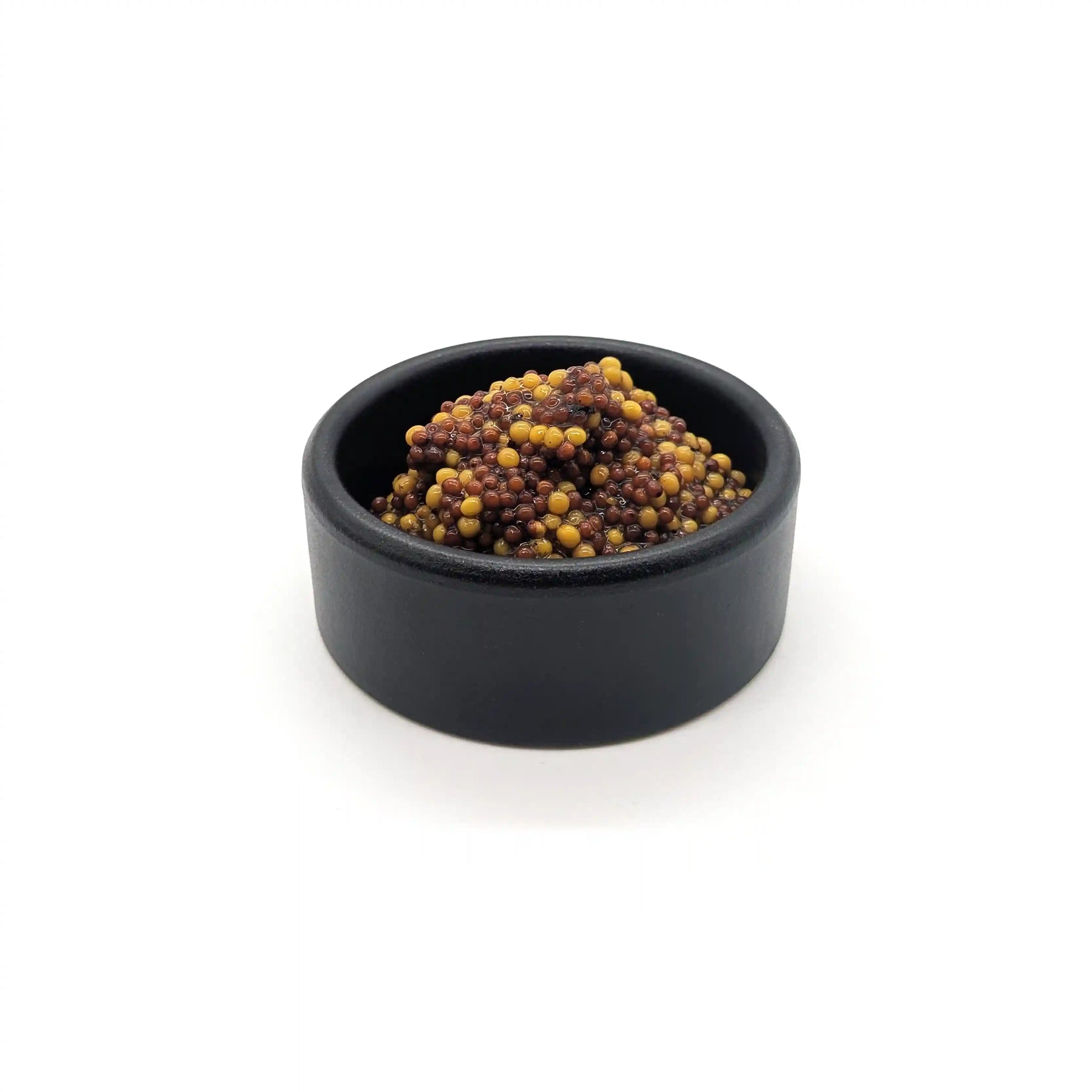 Feine Perlenstruktur: Anders als ein klassischer Senf besteht Okolo aus kleinen, perlenartigen Senfkörnern („Kaviar“), die beim Verzehr im Mund knacken.