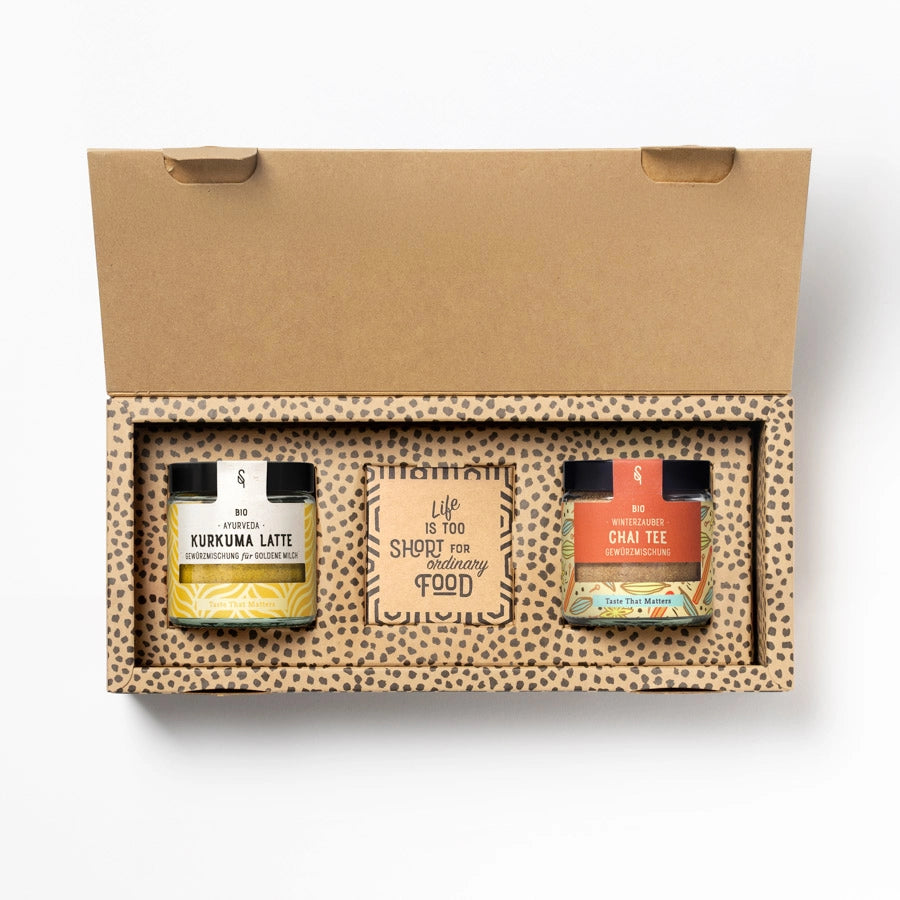 Verschenke mit diesem Set ein bisschen Wohlgefühl, Ruhe und Wärme. Mit Chai Tee und Kurkuma Latte von Soul Spice setzt du ein Zeichen für Auszeit und Erholung.