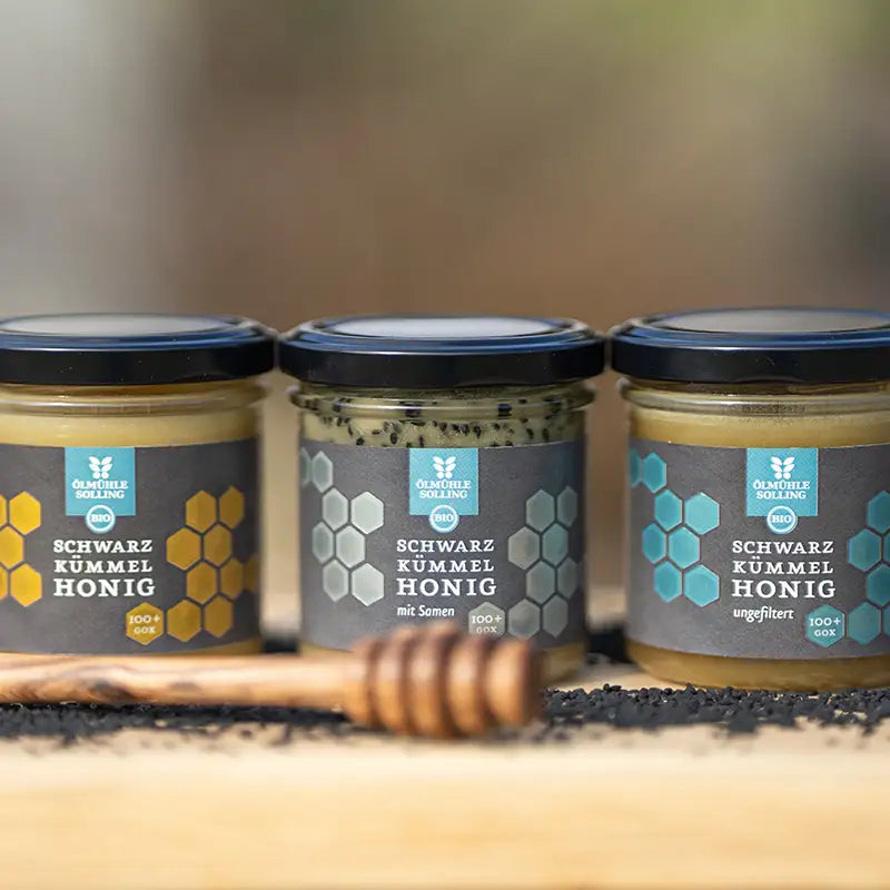 Diese drei neuen Honig-Spezialitäten der Ölmühle Solling vereinen alles, was ein gesundes Lebensmittel beinhalten sollte. Die Honige enthalten sowohl die wertvollen Inhaltsstoffe von regionalem, biologischem Kornblumenhonig und die Kräfte des ägyptischen Schwarzkümmels aus kontrolliert biologischer Landwirtschaft. Die Kombinationen mit gefiltertem und ungefiltertem Schwarzkümmelöl sowie mit Schwarzkümmelsamen machen diesen Honig zu etwas ganz einzigartigem.